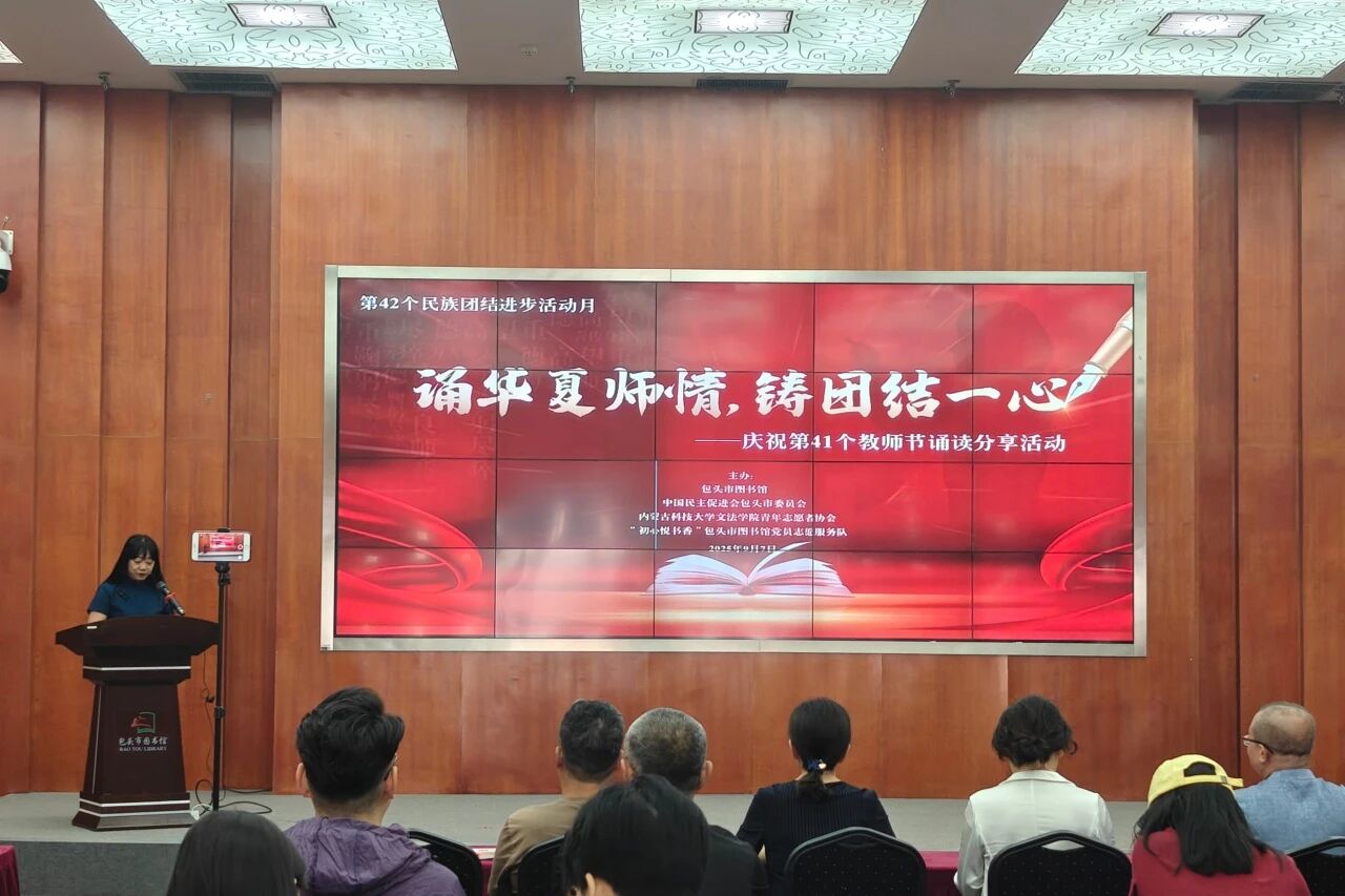2025年9月7日上午,包头市图书馆多功能厅内掌声不断,由包头市图书馆、中国民主促进会包头市委会与内蒙古科技大学文法学院青年志愿者协会联合主办的“诵华夏师情,铸团结一心”主题活动隆重举行。活动以庆祝第41个教师节和第42个民族团结进步活动月为契机,同时纪念中国民主促进会成立80周年、内蒙古民进成立40周年,通过诗朗诵、阅读分享、歌曲演唱、普法宣讲等多元形式,呈现了一场融合家国情怀、教育崇尚、民族团结与法治精神的文化盛宴。