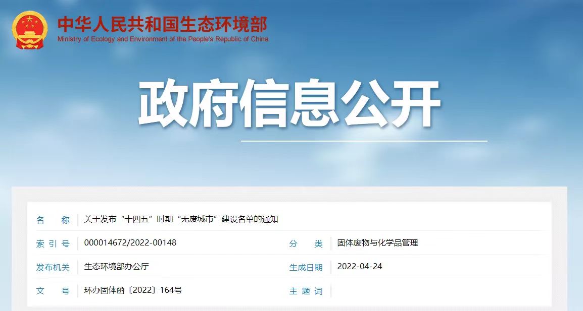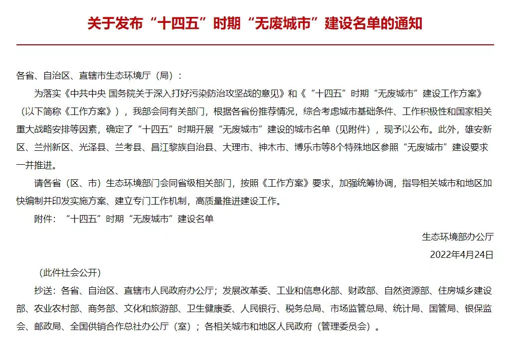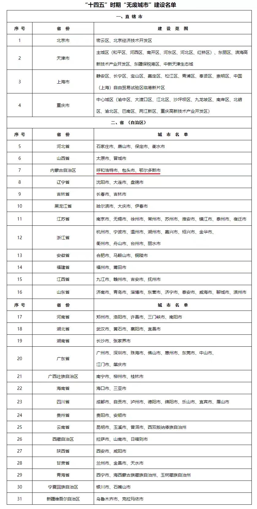 近日,生态环境部发布了《关于发布“十四五”时期“无废城市”建设名单的通知》。其中,生态环境部确定了“十四五”时期开展“无废城市”建设的城市名单。内蒙古呼和浩特市、包头市、鄂尔多斯市榜上有名。