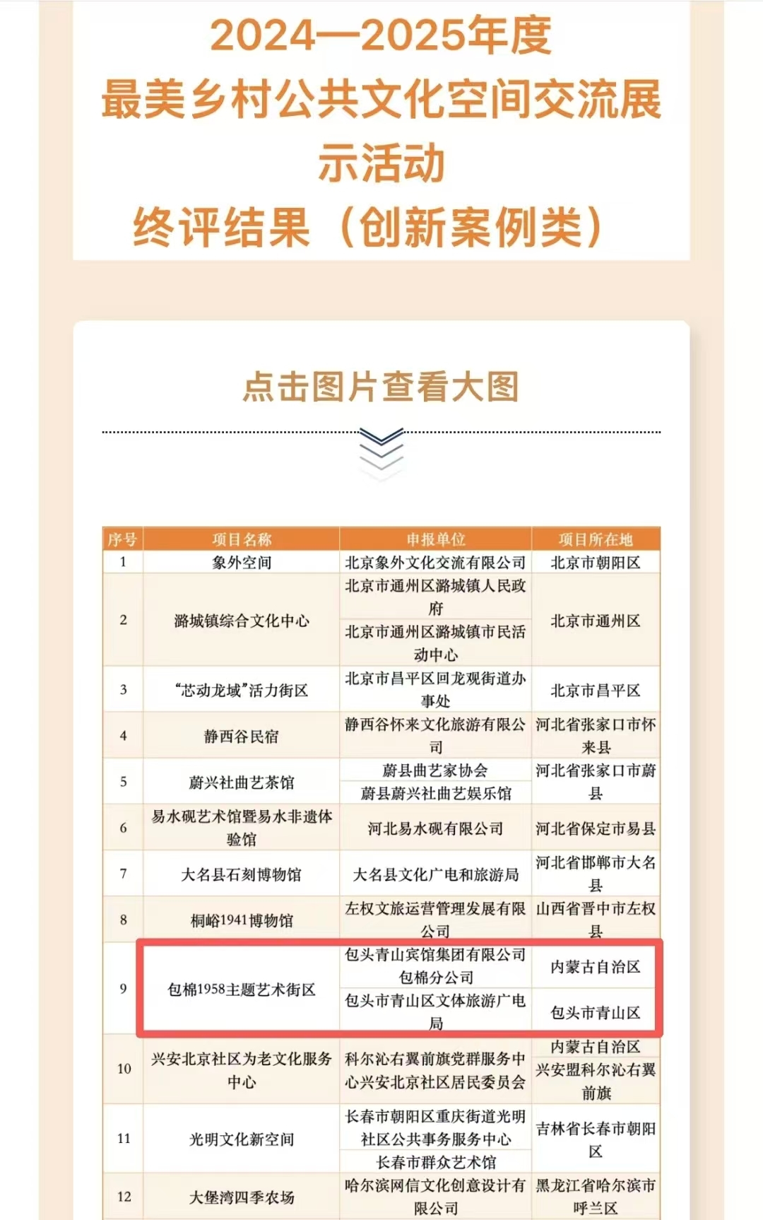 10月17日,文化和旅游部全国公共文化发展中心公布了入选“2024—2025年度最美乡村公共文化空间交流展示活动”终评名单,包头市青山区“包棉1958”主题艺术街区凭借独具特色的新型公共文化空间实践成果在创新案例类奖中脱颖而出,取得全区唯二、全市唯一的好成绩。